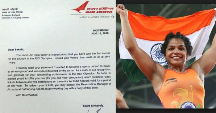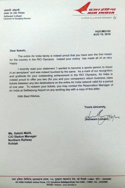 Air India addressed a letter to Sakshi saying that they are very happy and proud on her achievement. They have given her 2 return business class air tickets - one for her and other one for her companion. You might think what is so special in that, isn’t it? But wait, let us explain the special reason behind it.