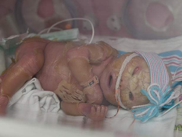 The baby was born pre-term with a hardened skin. The hard surface covering her body has cracks and she weighed 1.2 kg at birth. She has no ears, is completely blind though she has two bright red bulges in place of eyes, has just two small holes for a nose and an inverted eye lid.