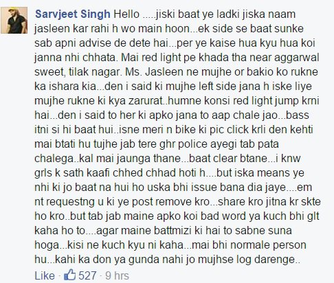 “Hello …..jiski baat ye ladki jiska naam jasleen kar rahi h wo main hoon…ek side se baat sunke sab apni advise de dete hai…per ye kaise hua kyu hua koi janna nhi chhata. Mai red light pe khada tha near aggarwal sweet, tilak nagar. Ms. Jasleen ne mujhe or bakio ko rukne ka ishara kia…den i said ki mujhe left side jana h iske liye mujhe rukne ki kya zarurat..humne konsi red light jump krni hai…den i said to her ki apko jana to aap chale jao…bass itni si hi baat hui..isne meri n bike ki pic click krli den kehti mai btati hu tujhe jab tere ghr police ayegi tab pata chalega..kal mai jaunga thane…baat clear btane…i knw grls k sath kaafi chhed chhad hoti h….but iska means ye nhi ki jo baat na hui ho uska bhi issue bana dia jaye….em nt requestng u ki ye post remove kro…share kro jitna kr skte ho kro..but tab jab maine apko koi bad word ya kuch bhi glt kaha ho to….agar maine battmizi ki hai to sabne suna hoga…kisi ne kuch kyu ni kaha…mai bhi normale person hu…kahi ka don ya gunda nahi jo mujhse log darenge..”