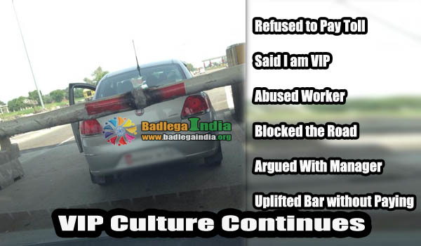 It is shocking to encounter that a VIP and other members in the car could behave in such an inappropriate manner and use their political powers to avoid a small amount of toll that is also paid by the rest public. It is unacceptable and unfair to use political power for personal gains as it is meant for the use of improvement for the public in general. Due to less amount of time, only two pictures could be clicked, but the number on the cars number plate, ” HR 06 U ***9″ is stuck in my head forever!